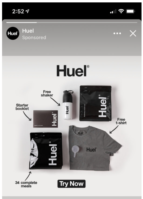 Huel đã sử dụng Facebook Stories để đưa thương hiệu đẹp mắt của mình đến gần hơn với người xem. Mặc dù thương hiệu đã bỏ lỡ cơ hội sử dụng các yếu tố tương tác (nhãn dán, GIF, video, v.v.), họ đã thành công với câu chuyện bằng một thiết kế gọn gàng, bắt mắt.