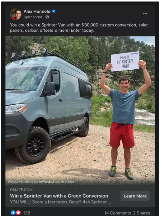 Alex Honnold, vận động viên leo núi đá lớn nổi tiếng thế giới, đã hợp tác với Omaze để gây quỹ cho tổ chức từ thiện Honnold Foundation. Quảng cáo sử dụng hình ảnh người có sức ảnh hưởng của Alex kết hợp với phong cách sống của anh (chiếc xe tải) để thu hút những người leo núi và những người đam mê hoạt động ngoài trời quan tâm đến sự kiện này.