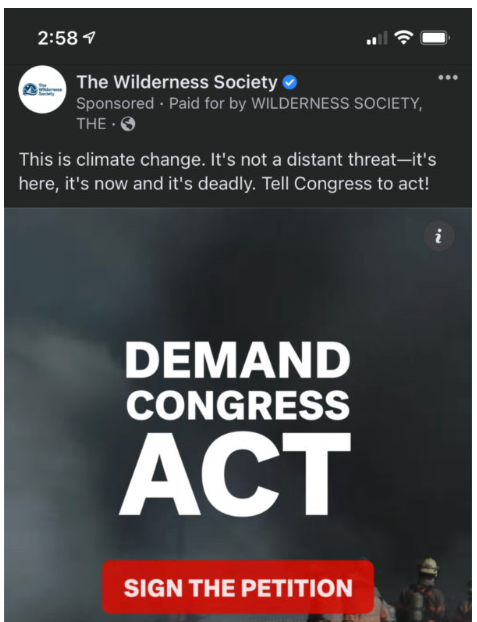 Hãy xem những từ ngữ nổi bật mà The Wilderness Society sử dụng trong quảng cáo: đe dọa, ngay lập tức, chết người và nhu cầu—đó là những nội dung truyền cảm hứng hành động. Với nội dung màu đỏ đậm, quảng cáo cho người xem biết chính xác những gì cần làm: "Ký vào Bản kiến nghị". Họ cũng đảm bảo quảng cáo trên Facebook được thiết lập nút CTA để điều phối.