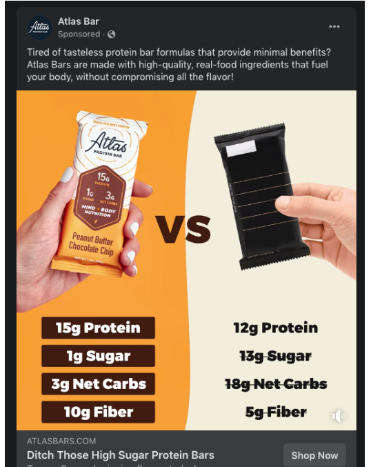 Đôi khi, chỉ cần một cuộc so sánh trực tiếp là đủ để khách hàng của bạn quyết định mua hàng. Thanh năng lượng Atlas đã làm rất tốt với video ngắn này, cho thấy thanh protein của họ vượt trội hơn so với đối thủ cạnh tranh như thế nào.