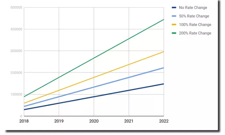 Trong năm hiện tại, bạn sẽ kiếm được 29.640 đô la và tích lũy được 148.200 đô la trong năm năm tới. Bây giờ, hãy dự đoán thu nhập của bạn trong năm năm tới với mức tăng trưởng 50% về thuế suất. Sau đó, hãy tăng lần lượt 100% và 200%.
