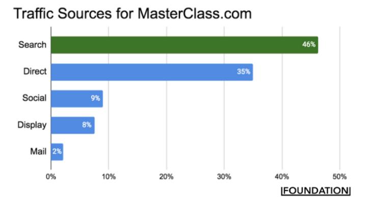 Mặc dù MasterClass chi một khoản tiền ấn tượng cho quảng cáo và sản xuất khóa học, nhưng Business Insider ước tính họ đã chi 6,5 triệu đô la cho quảng cáo vào năm 2019, phần lớn lưu lượng truy cập của họ đến từ tìm kiếm. FoundationInc phát hiện ra rằng vào năm 2019, 46% lưu lượng truy cập vào MasterClass đến từ các công cụ tìm kiếm.