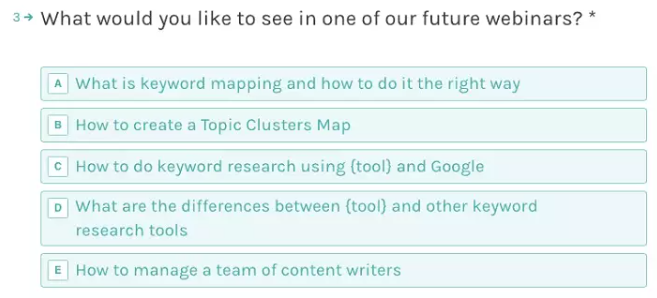 Ví dụ, giả sử bạn đã tổ chức một hội thảo trực tuyến về nghiên cứu từ khóa dành riêng cho khách hàng. Cuối buổi hội thảo, bạn đã vui lòng yêu cầu những người tham dự trả lời một vài câu hỏi liên quan. Những câu hỏi đó có thể là:
