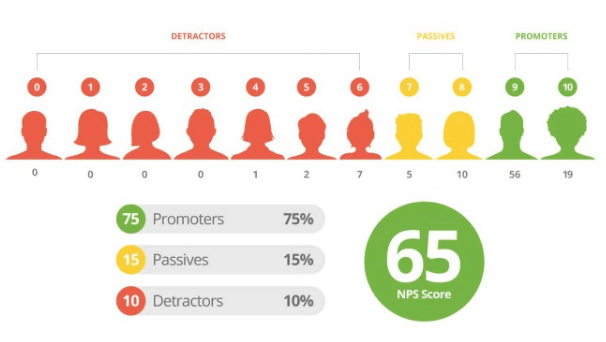 Điểm số người ủng hộ ròng (Net Promoter Score) đơn giản là tỷ lệ phần trăm khách hàng sẽ hoặc sẽ không giới thiệu thương hiệu của bạn cho bạn bè hoặc người thân. Điểm số này cũng có thể được xác định bằng một khảo sát đơn giản: "Khả năng bạn giới thiệu chúng tôi cho bạn bè hoặc gia đình là bao nhiêu?" Khách hàng đánh giá thương hiệu trên thang điểm từ 1 đến 10 và NPS được tính như trong hình ảnh này.