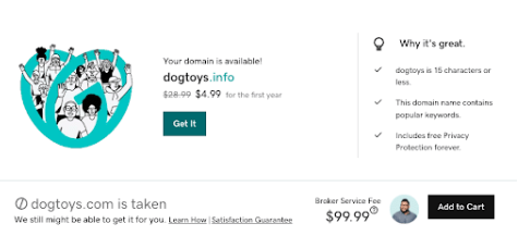 Nếu bạn yêu thích một tên trang web trước khi tìm được tên miền khả dụng, bạn có thể sẽ nhận được một URL như: https://www.doggietoys123.guru/.
