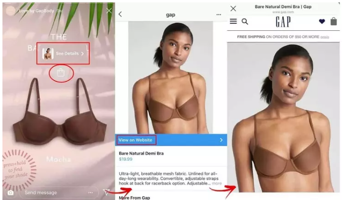 Nếu bạn quan tâm đến việc tạo story bán hàng trên Instagram , hãy chú ý đến GAP . Mỗi khi họ giới thiệu một sản phẩm trong story của thương hiệu, họ sẽ gắn thẻ sản phẩm và liên kết đến trang web để người dùng quan tâm có thể nhấp vào biểu tượng túi mua sắm và xem thêm chi tiết.