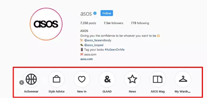 Hãy cùng xem xét ASOS . Khi người theo dõi mới truy cập trang cá nhân, mọi thông tin đều có sẵn ngay bên dưới phần tiểu sử.