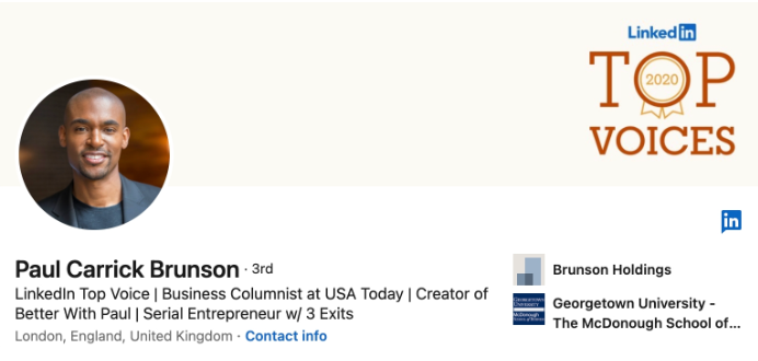 LinkedIn Top Voice Hồ sơ của Paul Carrick Brunson là ví dụ tuyệt vời về một tiểu sử được trình bày chuyên nghiệp với đủ cá tính nổi bật để thu hút người đọc.