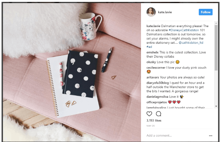 Có một vài cách khác nhau để bạn có thể hợp tác với người có sức ảnh hưởng. Bạn có thể thực hiện một chương trình khuyến mãi duy nhất chỉ kéo dài trong một khoảng thời gian ngắn. Điều này khá phổ biến đối với các buổi ra mắt sản phẩm, sự kiện hoặc chỉ đơn giản là quảng cáo Instagram nói chung. Dưới đây là ví dụ về bài đăng được tài trợ duy nhất mà Cath Kidston đã thực hiện với người có sức ảnh hưởng trên Instagram Kate La Vie, người tự hào có hơn 200.000 người theo dõi: