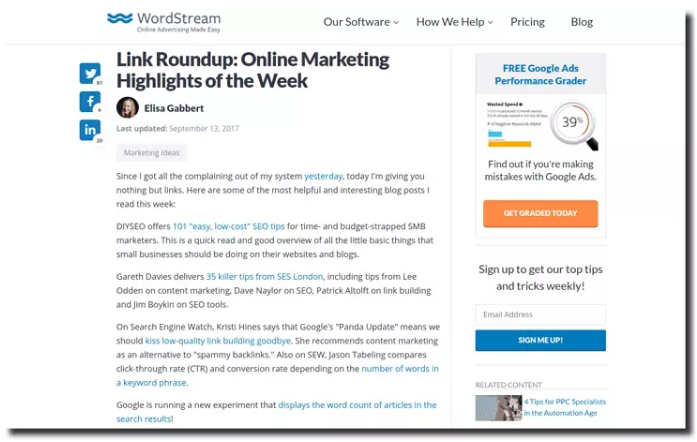 Sau đây là ví dụ về tổng hợp liên kết nội dung từ WordStream, một trang web tiếp thị trên Internet: