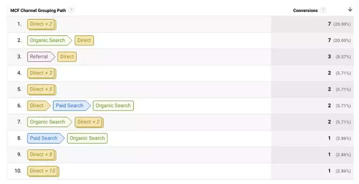 Dữ liệu này hiển thị trong tài khoản Google Analytics của bạn khi bạn điều hướng đến phần phễu đa kênh, hiển thị các tương tác khác nhau mà người dùng thực hiện với trang web của bạn dưới dạng kỹ thuật số. Điều này được thể hiện trong hình ảnh bên dưới.