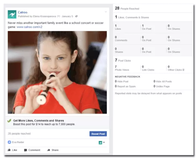 Bạn có thể thấy rõ sự khác biệt trong ví dụ dưới đây. Nhà sáng lập Calroo Family Organizer, một ứng dụng giúp bạn sắp xếp công việc gia đình bận rộn, đã đăng tải những nội dung tuyệt vời trong hơn một năm. Tuy nhiên, trang của cô ấy không hề phát triển và có lượng tương tác thấp. Lý do là gì? Phần lớn nội dung là các bài đăng trên blog mà cô ấy chỉ liên kết đến hoặc lời kêu gọi hành động mà không xây dựng được lòng tin cần thiết với độc giả.