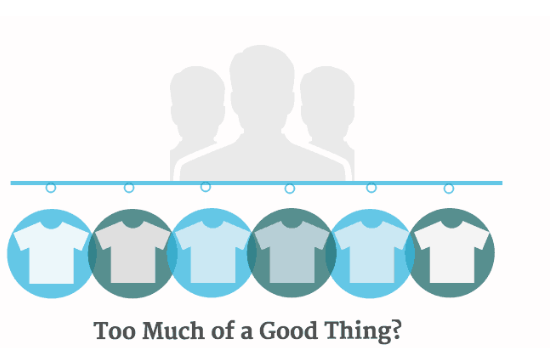 Nghe có vẻ trái ngược, nhưng việc hạn chế lựa chọn thực sự giúp việc mua sắm dễ dàng hơn. Một nghiên cứu của các nhà nghiên cứu tại Đại học Columbia và Stanford cho rằng tình trạng quá tải lựa chọn tồn tại , thách thức những giả định trước đây cho rằng nhiều lựa chọn hơn luôn tốt hơn. "Kết quả từ 3 nghiên cứu thực nghiệm đã thách thức hoàn toàn giả định ngầm định này rằng việc có nhiều lựa chọn hơn nhất thiết mang lại động lực nội tại hơn so với việc có ít lựa chọn hơn."
